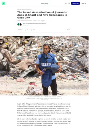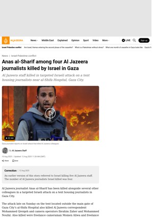 Late on Sunday, August 10, 2025, just weeks after these warnings, an Israeli strike on “a tent housing journalists” outside Al-Shifa Hospital’s main gate killed Al-Sharif, alongside journalists Mohammed Qreiqeh and Mohammed al-Khalidi, and camera operators Ibrahim Zaher, Mohammed Noufal, and Momen Aliwa. The IDF proudly announced the strike, reiterating their accusations against Al-Sharif. They did not bother to acknowledge the five other press workers killed.