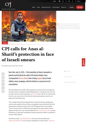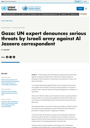 The CPJ publicly called for Al-Sharif’s protection. It warned that, “The [IDF] Arabic spokesperson Avichay Adraee has stepped up his online attacks on al-Sharif, by falsely alleging that he is a Hamas terrorist.” Regional Director Sara Qudah added, “the danger to his life is now acute . . . These latest unfounded accusations represent an effort to manufacture consent to kill Al-Sharif.” The U.N. Special Rapporteur on freedom of expression also raised the alarm: “I call on all States, especially those who pride themselves on being champions of media freedom and safety for journalists, not to remain silent in the face of this blatant assault on journalists . . . I urge them to use their diplomatic channels to stop Israel from targeting Anas Al-Sharif and other journalists in Gaza who are only doing their job of telling the truth to the world.”