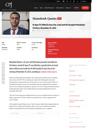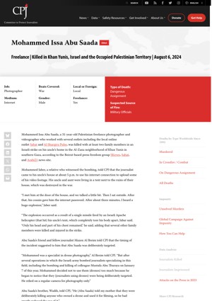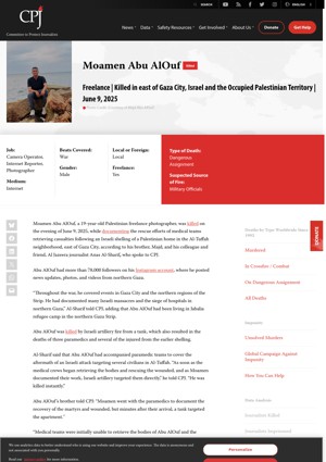 Freelance photographer Moamen Abu AlOuf accompanied paramedics to cover the aftermath. “As soon as the medical crews began retrieving the bodies and rescuing the wounded, and as Moamen documented their work, Israeli artillery targeted them directly,” journalist Anas Al-Sharif told the CPJ. “He was killed instantly.” Abu AlOuf had “covered events in Gaza City and the northern regions of the Strip.”