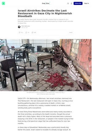 Strikes on public spaces where journalists worked also became routine. The same day Abdo was killed at the Al-Karama school, Israeli airstrikes hit “the last restaurant still open in Gaza City.” Once a “Gaza City landmark—bustling with patrons,” Thai Restaurant by then served “only hot drinks and slices of pizza,” journalist Rasha Abou Jalal wrote. “The restaurant became a popular gathering place for journalists who are always looking for power sources to charge their phones and equipment, and a place with reliable internet to file their stories. I would come to the restaurant at least twice a week with my laptop and sit at one of the tables to finish my articles.”