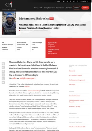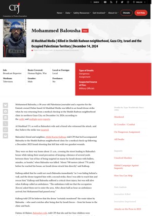 Weeks after breaking a story that drew international attention, Mohammad Balousha was also shot by a sniper. He survived and returned to work about five months later. On December 14, 2024, an Israeli drone struck the journalist twice about 700 meters from his home, as he returned from a medical check-up for his gunshot wounds. He died before paramedics could reach him.