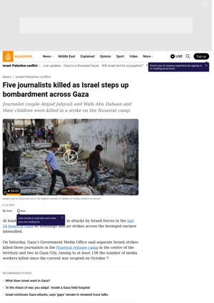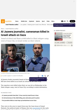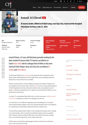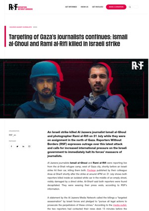 On July 31, 2024, al-Ghoul was reporting with his cameraman, Rami al-Rifi, when a strike hit a house near their location. They notified their news desk and “were told to leave immediately.” Less than five minutes after they drove away, a drone hit their car. Both men were killed, along with 17-year-old Khaled al-Shawa, who had been out on a bike delivering food to an elderly man.