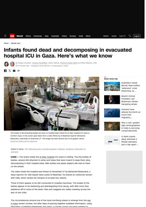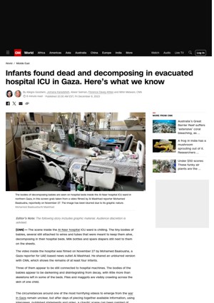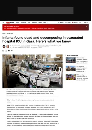 After weeks in which the hospital complex was “largely unreachable to journalists,” Balousha managed to enter. There, he found the decomposing remains of “at least four infants” in the ICU ward. His discovery of those left behind without any means of medical evacuation was covered by The Washington Post, CNN, and NBC, among others. When CNN repeatedly asked why, despite the officer’s assurance, ambulances were not provided, “the IDF did not directly respond.”