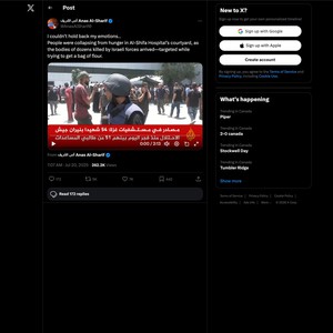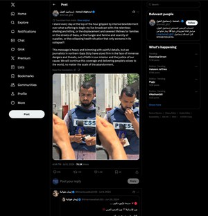 On July 20, 2025, reporting from the Al-Shifa Medical Complex on malnutrition and the lack of food, he took a moment to hold back tears. Minutes later, a woman nearby collapsed from hunger. As Al-Sharif directed his camera toward her and described the scene, his voice broke. “I couldn’t hold back my emotions... People were collapsing from hunger . . . as the bodies of dozens killed by Israeli forces arrived—targeted while trying to get a bag of flour,” he wrote afterward. The footage spread quickly and began the IDF’s final campaign to paint the journalist as a target.
