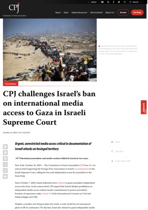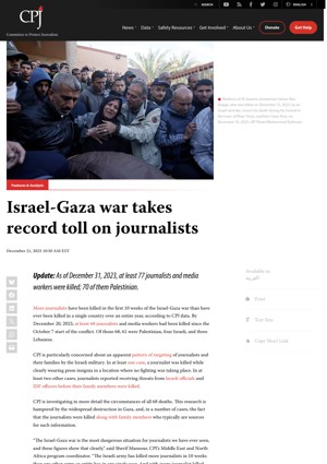 In October 2023, as Israel began its offensive in Gaza, Russia’s invasion of Ukraine was well into its second year. By then, 15 journalists and media workers had been killed there. In just over two weeks, Israeli forces surpassed that toll in Gaza. Within ten weeks, they had killed more journalists than “any other army or entity . . . in any single year” since the Committee to Protect Journalists (CPJ) began documenting such deaths in 1992.