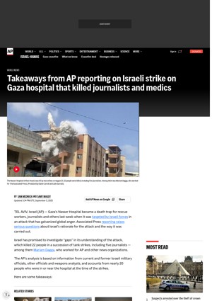 In another attack, on August 25, 2025, an Israeli tank fired on an outside staircase at Nasser Hospital, killing Reuters correspondent Hussam al-Masri. According to hospital officials, he had broadcast from the site “almost daily.” “Witnesses said a drone frequently observed the position, including about 40 minutes before the attack,” the Associated Press reported.