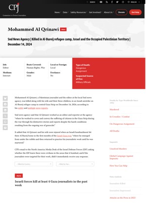 “I live with the feeling that I could be bombed and martyred at any moment. My family is also in danger,” the journalist told the CPJ. “This feeling is difficult and painful, but it does not push me back. Rather, it motivates me to continue fulfilling my duty and conveying the suffering of our people, even if it costs me my life.”