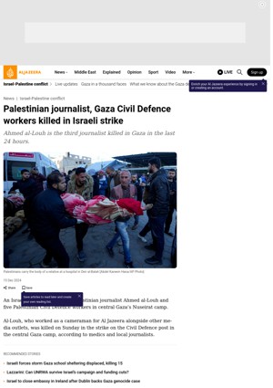 “Minutes after medical and emergency workers and journalists gathered there to help casualties from the first strike,” a tank fired again. The second strike killed journalists Moaz Abu Taha, Mariam Abu Dagga, Ahmed Abu Aziz, and Al Jazeera camera operator Mohammed Salama. In total, the attacks left 22 dead.