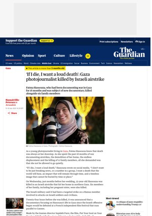 For 18 months, 25-year-old photojournalist Fatma Hassouna documented airstrikes, displacement, and the killing of 11 relatives. On April 15, 2025, a documentary featuring her was selected for screening at Cannes. The next day, at “around 1:00am, while the family was asleep,” an Israeli strike killed Hassouna and “six members of her family, including her pregnant sister.”