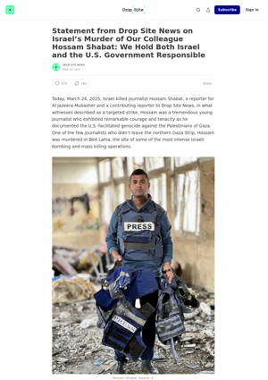 Speaking the day after an Israeli drone killed journalist Hossam Shabat, Middle East analyst Mouin Rabbani observed: “We’ve now reached the stage where Israel no longer denies targeting journalists, but claims it is justified in doing so. It no longer denies it is bombing and destroying hospitals, but claims that it is justified in doing so. It no longer denies that it’s murdering children by the bushel, but claims that it is right to do so.” Shabat, the young reporter whose final message opens this piece, worked for Al Jazeera Mubashar and Drop Site News. The IDF quickly claimed his killing, alleging that he was a “terrorist.”