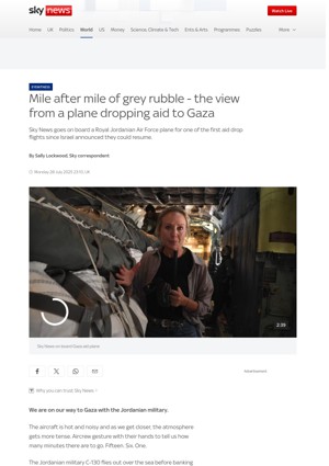 In 2025, a few journalists joined airdrop flights over the Strip. “We were given quite a clear and strict pre-flight briefing that the Israelis have said we’re not allowed to film any shots of Gaza from the air, and that if we do, these airdrop flights could either be canceled or delayed,” Sky correspondent Sally Lockwood reported. The BBC’s Jeremy Bowen noted, “Israel will not allow reporters like myself to enter Gaza to report the story, and they don’t want us to see it — to film it, anyway — from above, either.” A CBC reporter described a similar experience: “We cannot show you what we see outside these windows. The Israelis have forbidden any media images of what’s happened down on the ground. But we can see the flattened landscape of neighbourhoods.”
