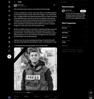 If you’re reading this, it means I have been killed—most likely targeted—by the Israeli occupation forces. When this all began, I was only 21 years old—a college student with dreams like anyone else. For [the] past 18 months, I have dedicated every moment of my life to my people. I documented the horrors in northern Gaza minute by minute, determined to show the world the truth they tried to bury. I slept on pavements, in schools, in tents—anywhere I could. Each day was a battle for survival. I endured hunger for months, yet I never left my people’s side.